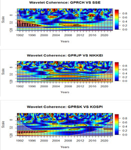 in equation (3) is a smoothing operator, without which the wavelet coherence is equal to one at all scales. The coherence squared coefficient varies from 0 ≤ ≤ 1, with the values close to zero implying a weak correlation and movement towards one implying a strong correlation. Therefore, the wavelet coherence square coefficient helps to analyze co-movement or interdependence between two financial time series like stock market prices and geopolitical risks. In this study, the return series of each country’s stock market prices are computed as with price data sourced from www.investing.com, while the geopolitical risk data is obtained from Caldara and Iacoviello (2022) construct.